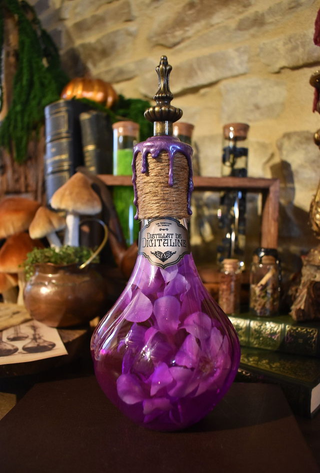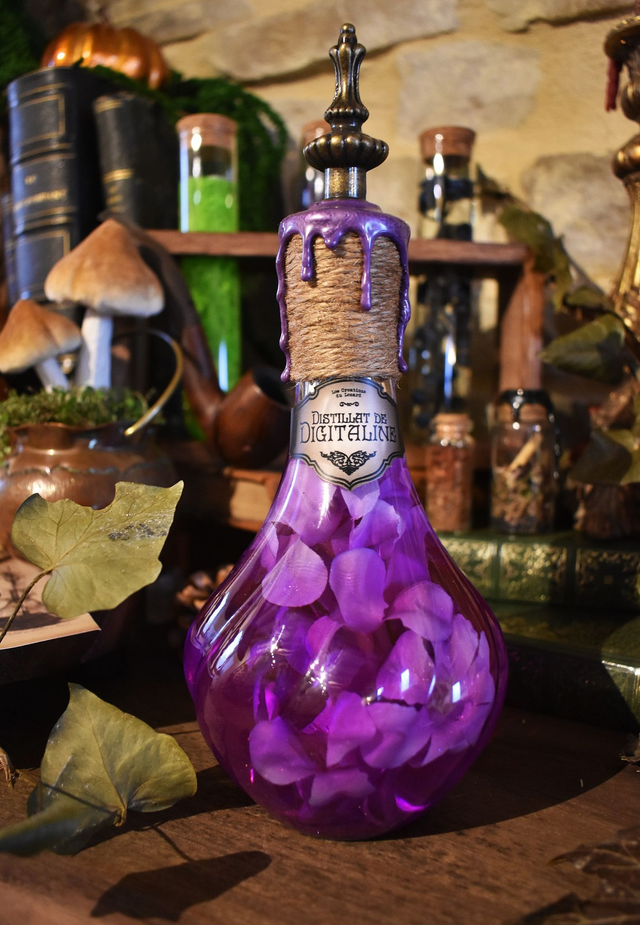 Ce premier flacon dédié aux plantes toxiques est directement inspiré d'une fleur commune dans la région normande, qui pousse souvent en bord de route. Une plante haute aux fleurs disposée en grappes, variant du rose au violet foncé. Ne vous fiez pas à sa belle apparence, car il s'agit en réalité d'une fleur très toxique...dont nous avons issue les toxines pour en faire cette potion aux volutes tout à fait hypnotisantes !